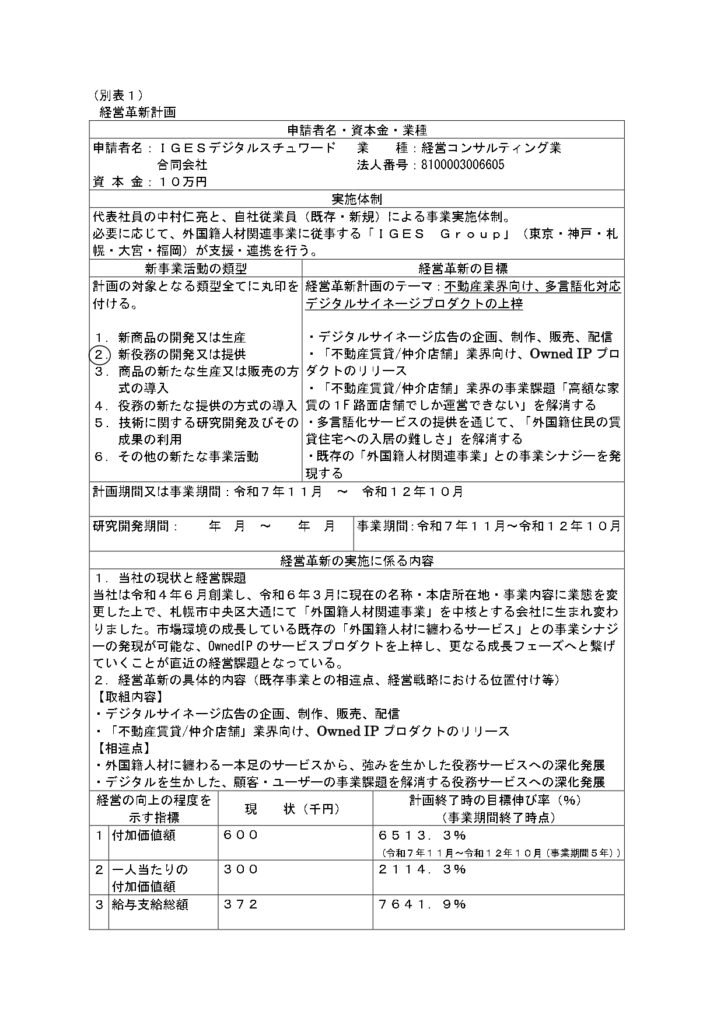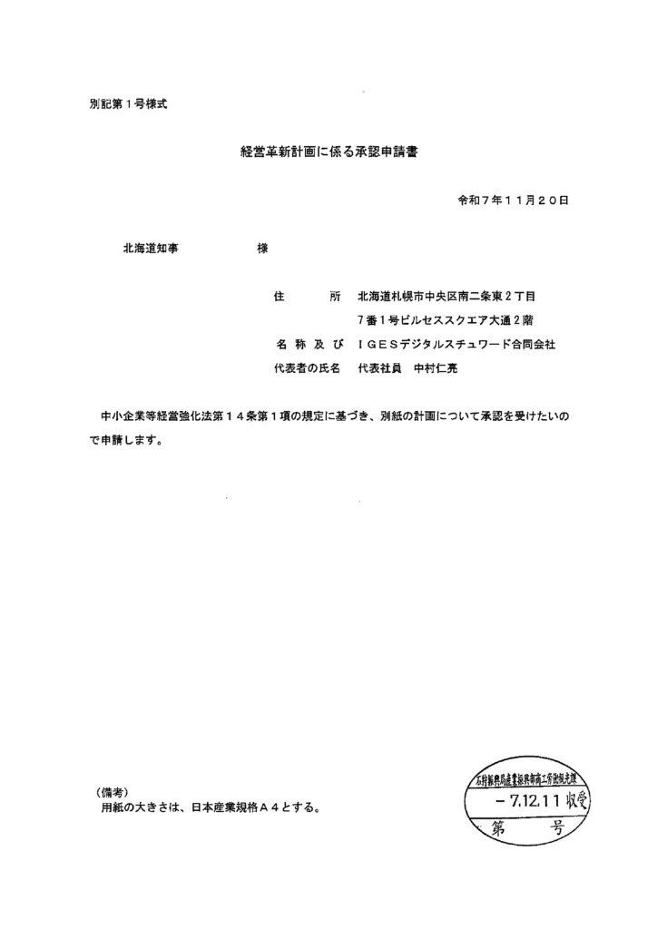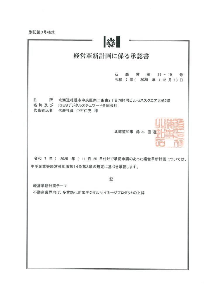 当社のグループ会社であるIGESデジタルスチュワード合同会社(北海道札幌市)の新規事業計画である「不動産業界向け、多言語化対応デジタルサイネージプロダクトの上梓」が、2025年12月18日付けで、北海道「経営革新計画(石商労第39-19号)」の承認を受けました。