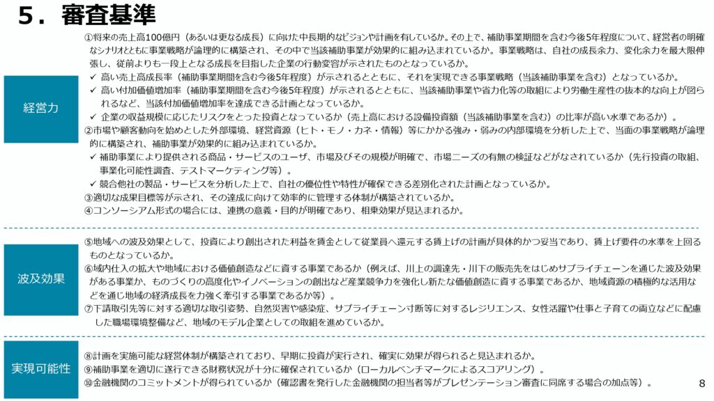 それに加えて、年間で100件以下になると想定される採択社数に相応の「投資計画」、他の申請企業とは異なるユニークな「投資計画」、(5)成長の加速化を”必ず”実現できると思えるような「投資計画」、地域活性化への寄与の非常に高い「投資計画」を、認定経営革新等支援機関他の支援機関に丸投げせずに、自社の取り組みとして、(4)“我が事”, “自分事”としてとして、共同して作り上げること、これが非常に重要です。